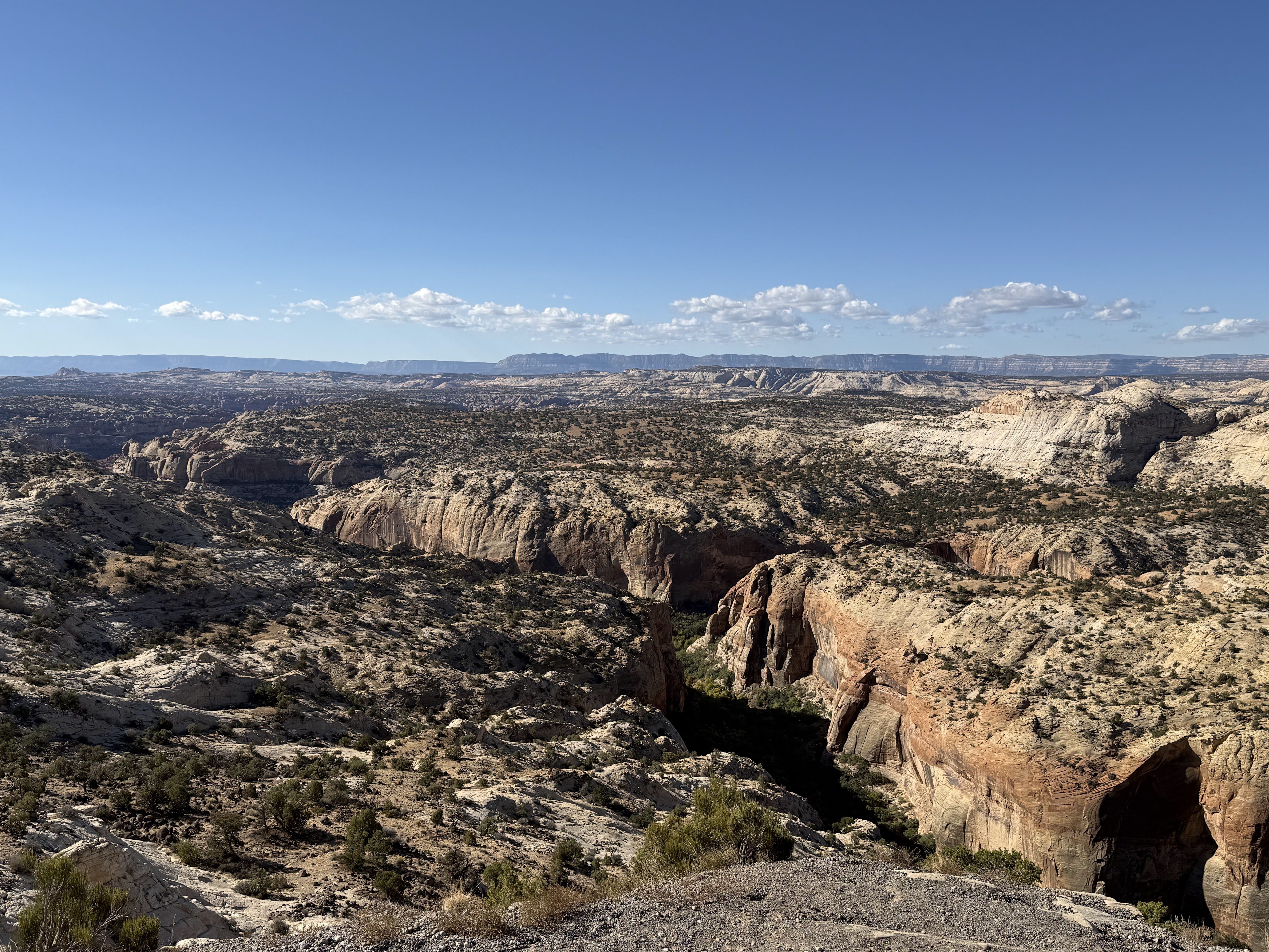 I’m not sure if it was intentionally planned this way but Day 6, our last day, ended up being the best of the trip. The clouds had finally moved on and we had sun consistently the entire day. Besides a few minor uphills on easy roads, we had mostly downhills as we coasted above the Grand Staircase National Monument and blasted down the road at speeds near 40 mph into the valley. High speed turns, wind in your face, steep drops to your right and left: it felt like a long amusement park roller-coaster.